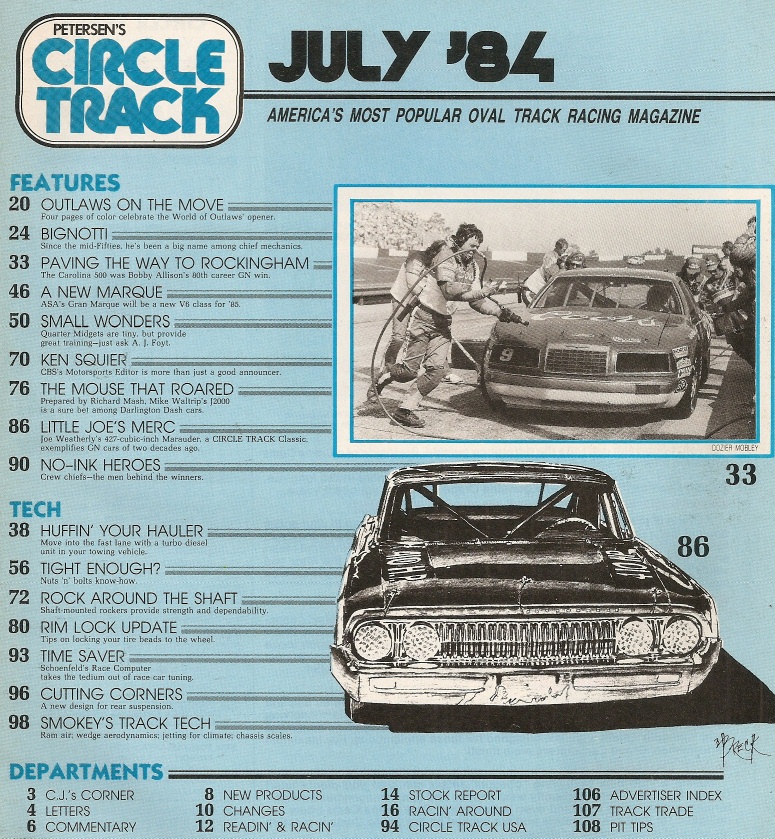 Reviews CIRCLE TRACK 1984 JULY - OUTLAWS ACTION, G BIGNOTTI, GRAND MARQUE V6, SQUIER