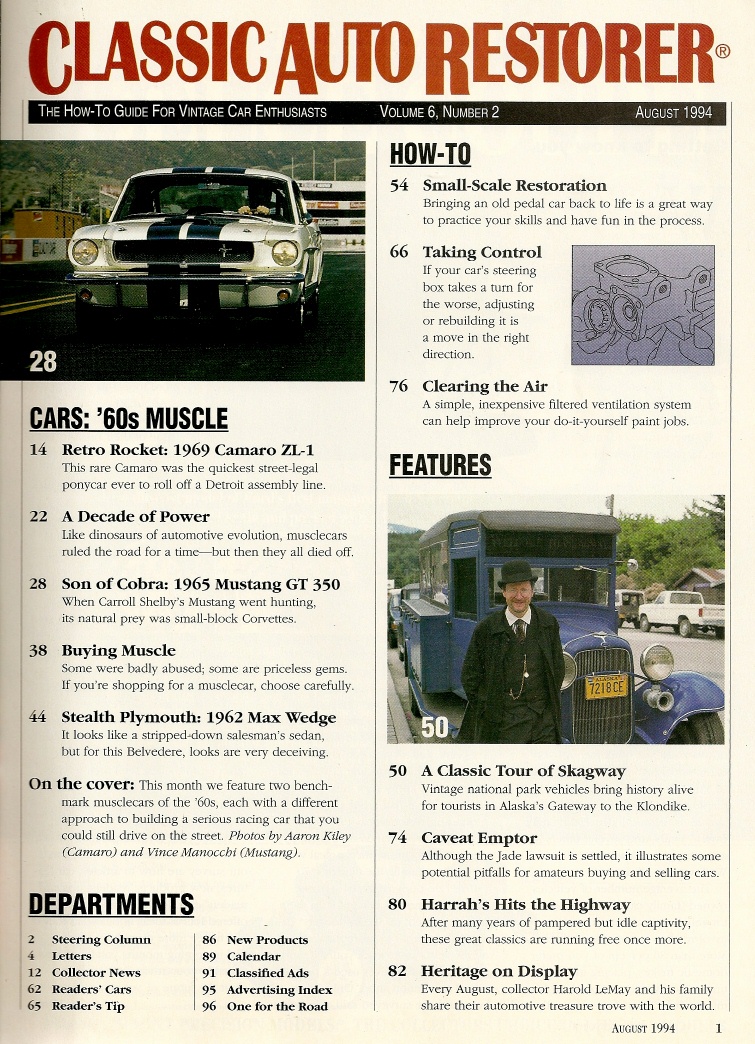 Reviews CLASSIC AUTO RESTORER 1994 AUG - 69 ZL-1 CAMARO, 65 GT350, 62 MAX WEDGE