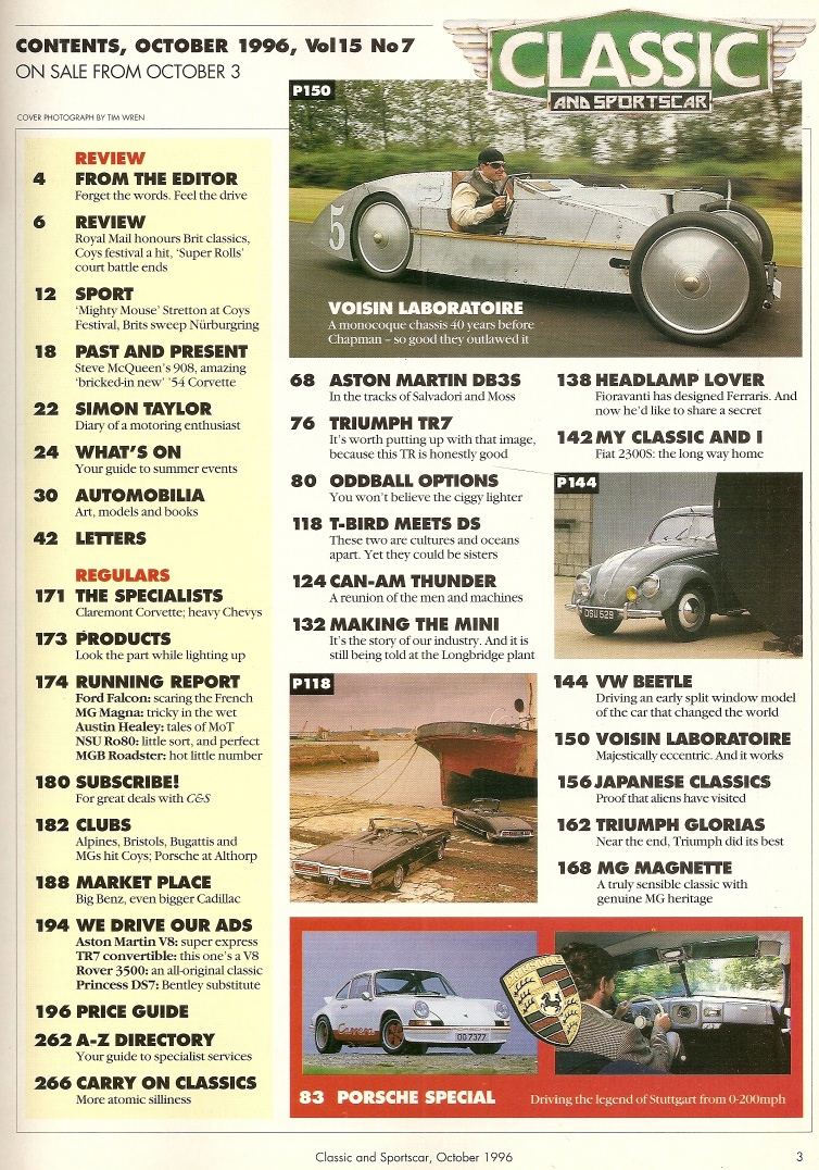 Reviews CLASSIC & SPORTSCAR 1996 OCT - PORSCHE Spcl, TR7, DBSS, CAN-AM
