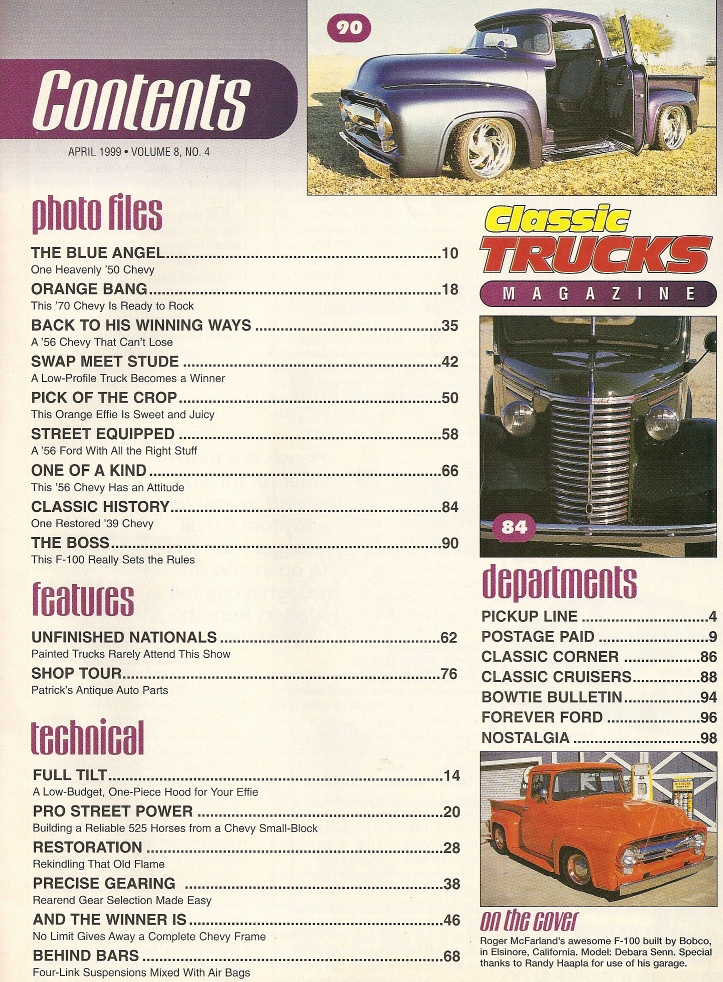 Reviews CLASSIC TRUCKS 1999 APR - '50 CHEVY, '70 CHEVY, ORANGE ELFIE, '56 FORD