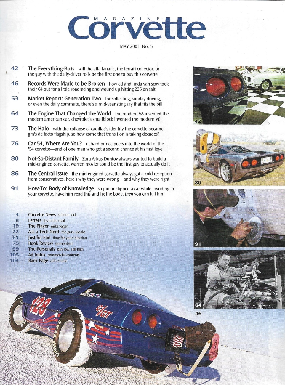 Reviews CORVETTE MAGAZINE 2003 MAY - '54 VETTE, BODY FIX, 225 IN A SALTY C4, V8 HIST