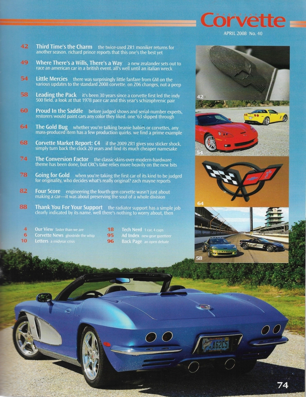 Reviews CORVETTE MAGAZINE 2008 APR - ZR1, CRC'S HYBRID C5/'62, '08 INDY REPLICA,C4 HIST