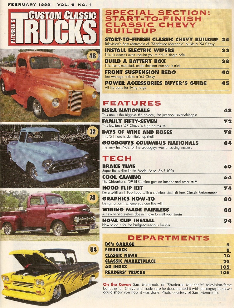 Reviews CUSTOM CLASSIC TRUCKS 1999 FEB - '64 CHEV FRONT SUSP, BATTERY BOX, WIPERS
