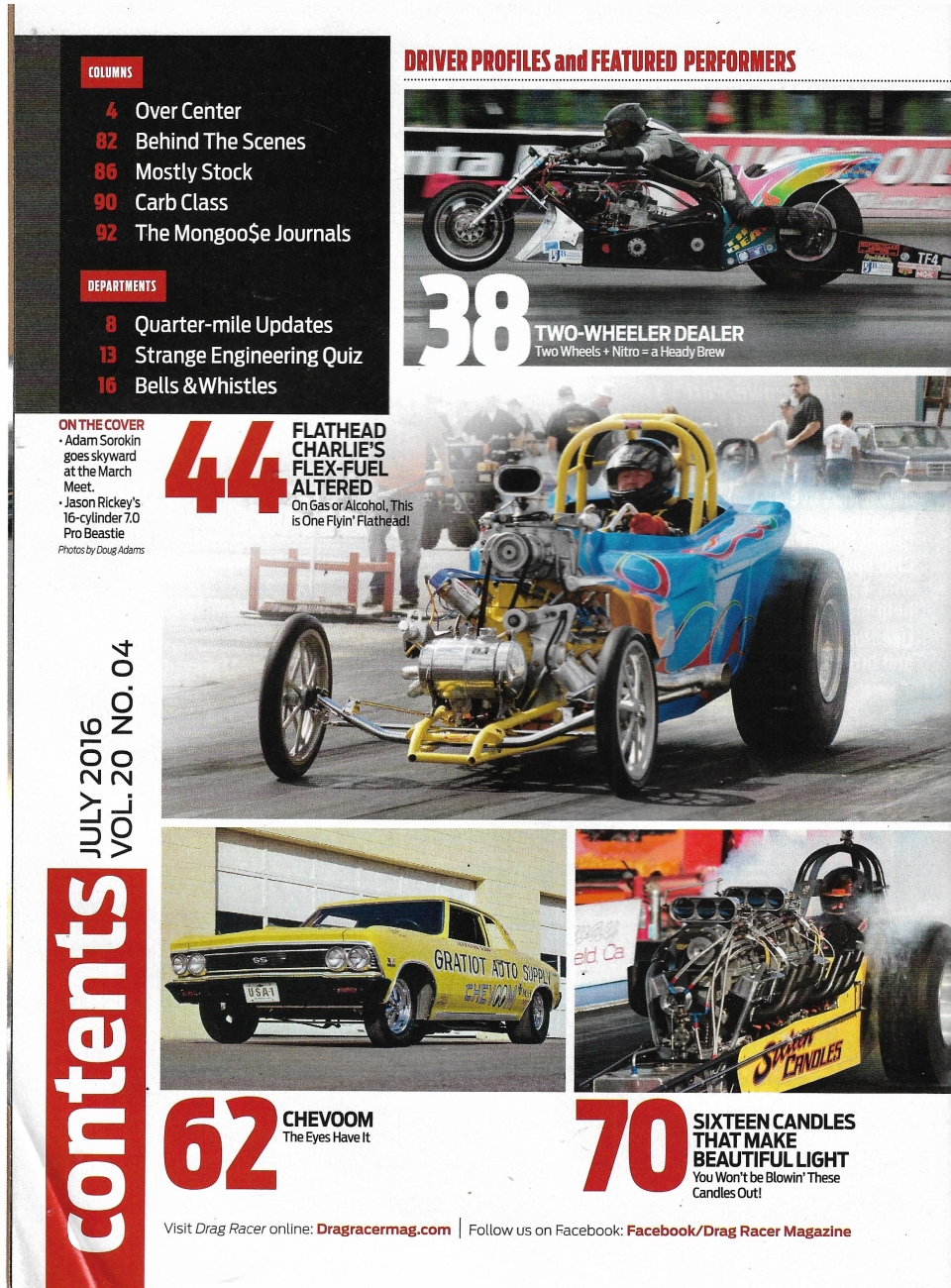 DRAG RACER 2016 JULY - MORE COPO FULE INJ, ALT-FUEL FLATHEAD, TWO WHEELS+NITRO