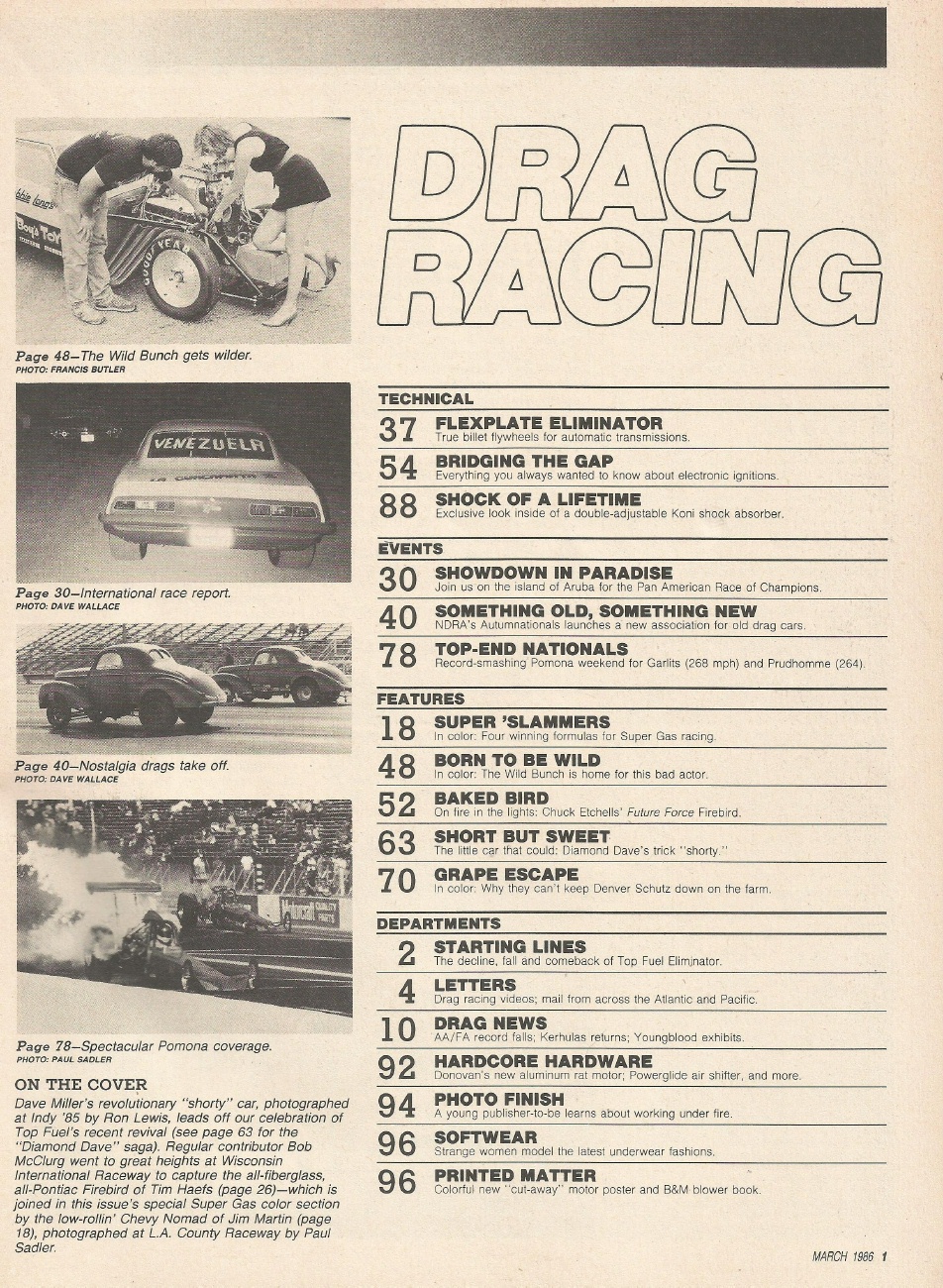 Reviews DRAG RACING 1986 MAR - POMONA, SUPER GAS Spcl, ARUBA, ROBBIE LONG*