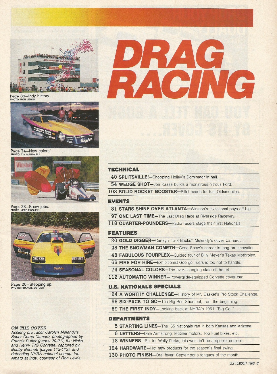 DRAG RACING 1988 SEPT - WILD FORD WEDGE, INDY HISTORY, US NATS