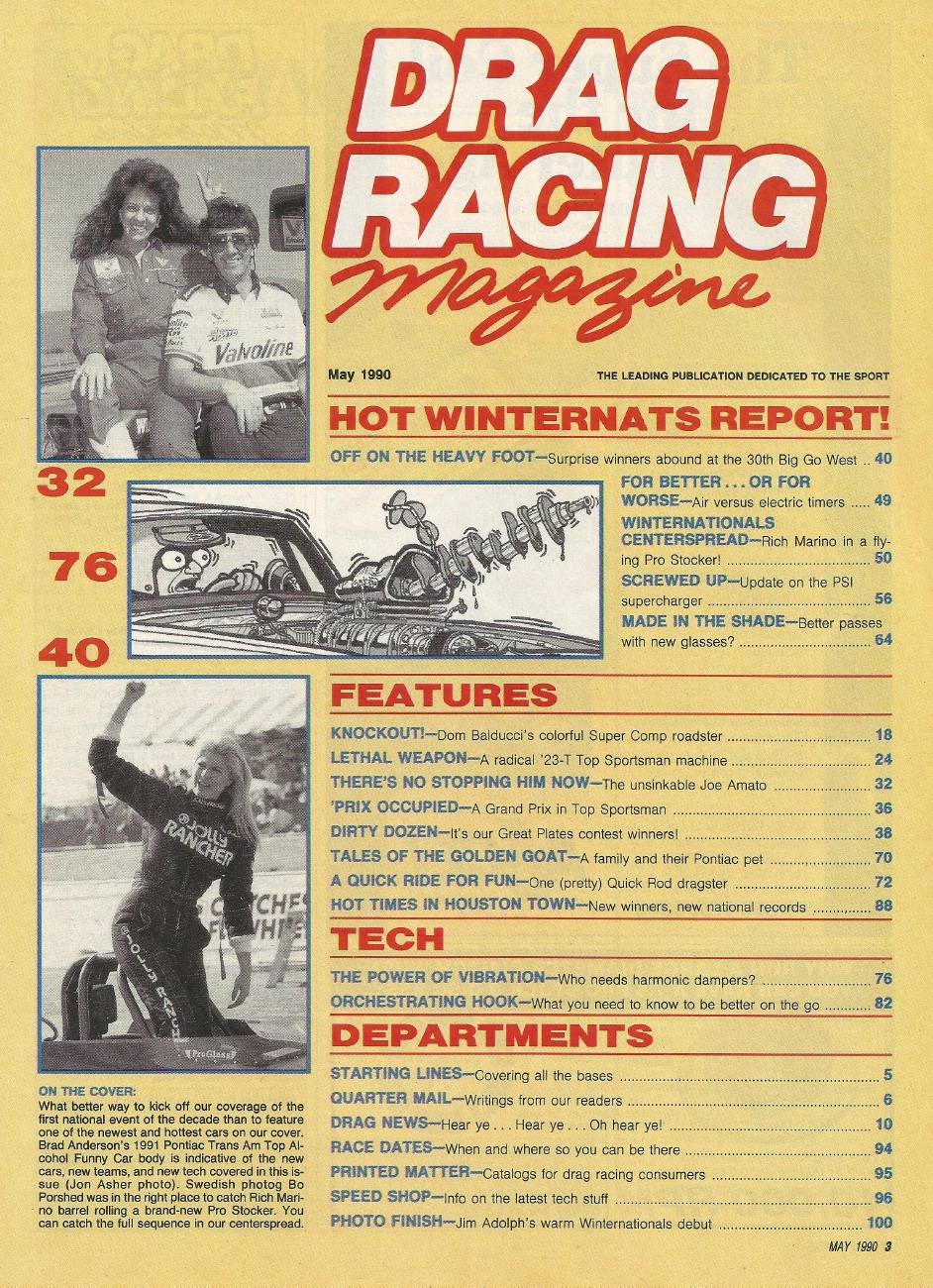 DRAG RACING 1990 MAY - MARINO FLIES, LETHAL WEAPON, BALDUCCI, KORELEC