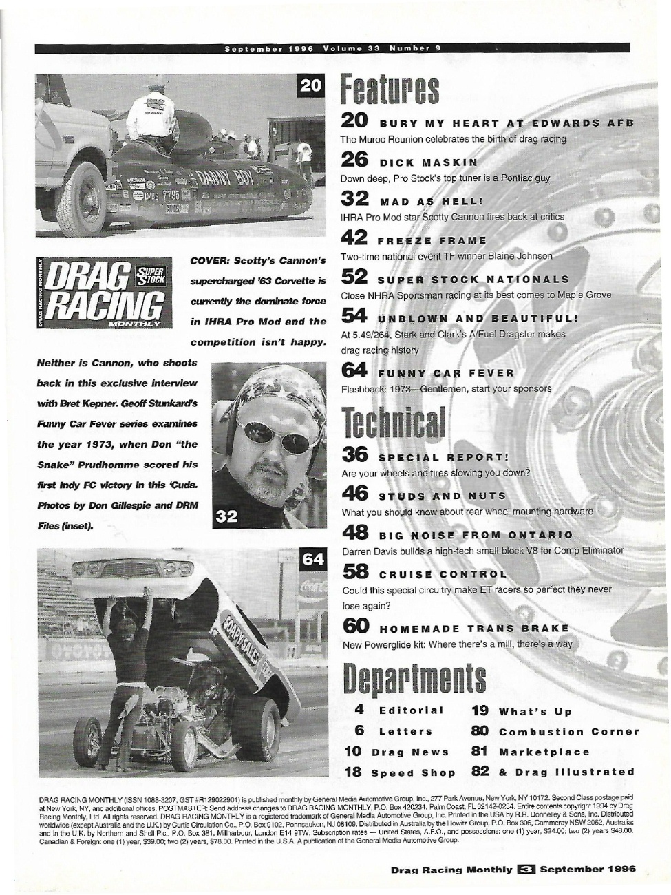 Reviews DRAG RACING MONTHLY 1996 SEPT - CANNON, 1973 FUNNY CARS, MASKIN