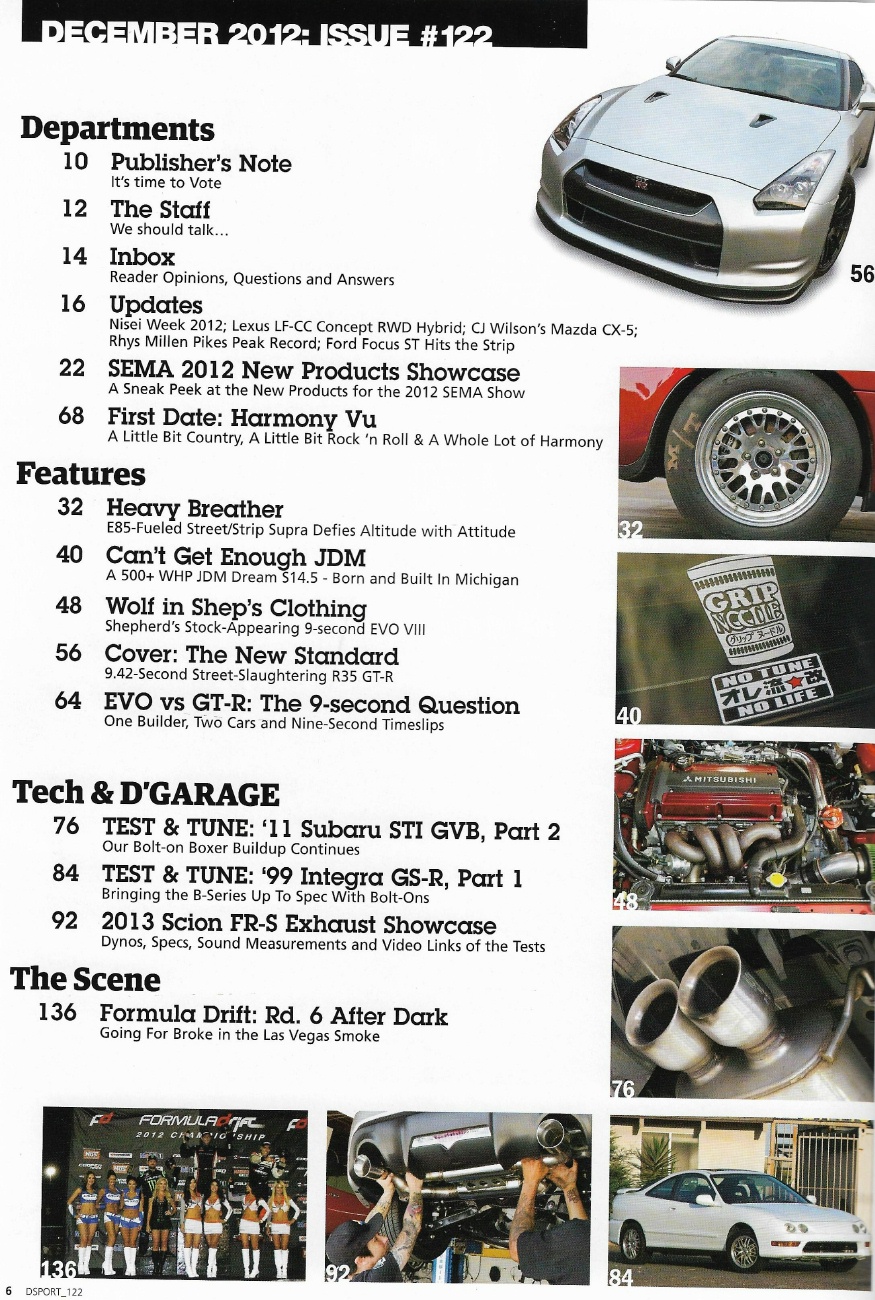 Reviews DSPORT 2012 DEC - GT-R, FR-S/BRZ EXHAUST, STI(GVB) PT 2, INTEGRA DC2, EVO,SUPRA