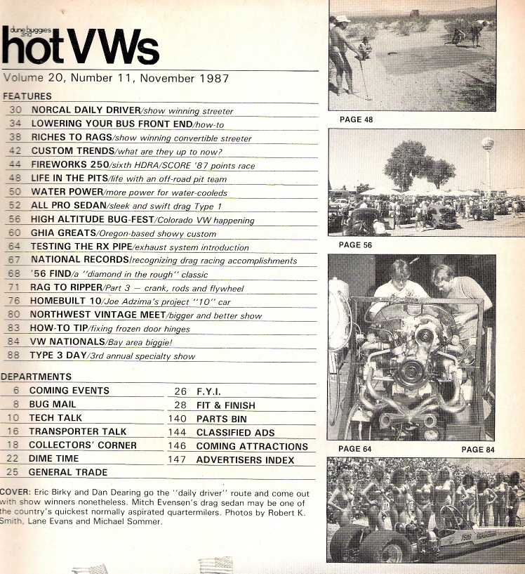 Reviews DUNE BUGGIES & HOT VW'S 1987 NOV - DROP A BUS, DOOR HINGE REPAIRS, EXHAUST TEST