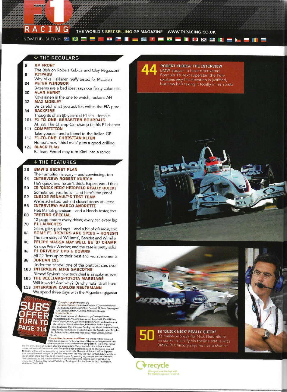F1 RACING 2007 FEB - KUBICA,BMW/F1,RENAULT TEAM, MASSA, JORDAN 191,GASCOYNE