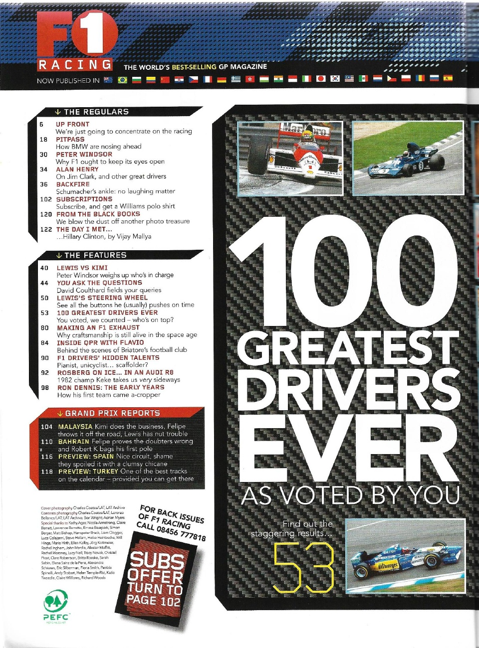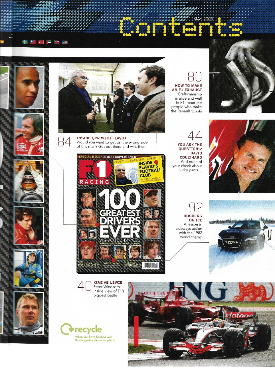 F1 RACING 2008 MAY - GREATEST DRIVERS, KIMI VS LEWIS,AUDI R8 ON ICE,RON DENNIS