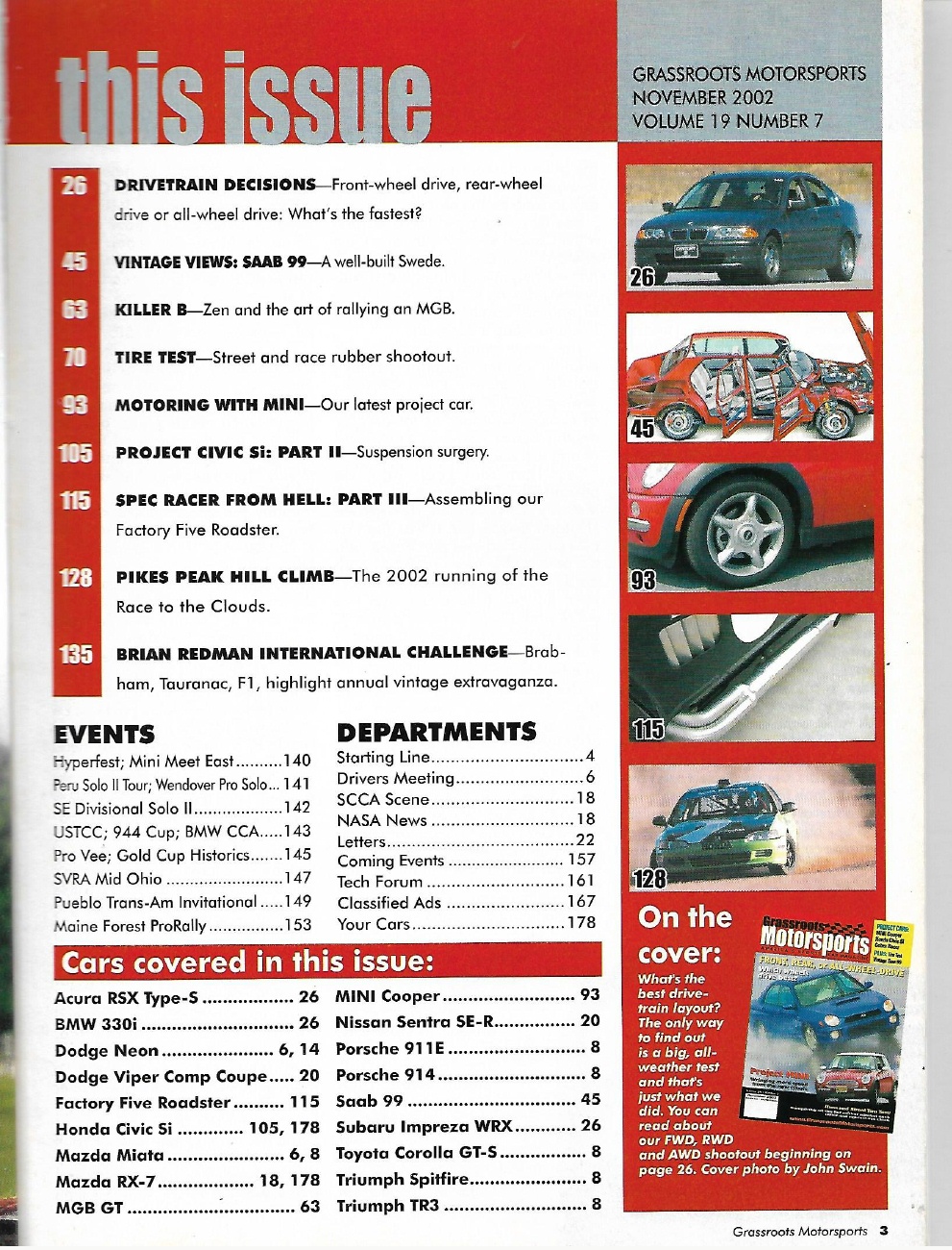 GRASSROOTS MOTORSPORTS 2002 NOV - PROJ MINI, HONDA CIVIC, COBRA, SAAB 99