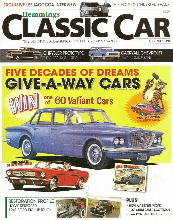 HEMMINGS CLASSIC CAR 2012 MAY - SCOTSMAN, CARRYALL, A-227 FWD, LINCOLN WAGONWithin this issue you will discover the following special topics 1) Those great give-a-way cars 2) Admiring a restored '58 Studebaker Scotsman 3) A beautiful '56 Lincoln custom-bodied station wagon 4) A '67 Pontiac Executive survivor 5) History of automotive design: The 1950-'51 Chrysler A-227 front-wheel-drive 6) A profile of Lee Iacocca 7) Restoring a '41 Ford pickup 8) A tribute to Henry Timken 9) Mechanical Marvels: The paper element air filter 10) Bud Bravick on his days at Pontiac 11) Recalling the '67-'72 Suburban Carryall 12) Clessie Cummins running Indy in 1931 Plus the following regular topics: 1) The latest in auction news 2) Tech & restoration questions and answers 3) Lost and found classics 4) Classic auto art 5) Letters to the editor Plus other interesting classic car items. |