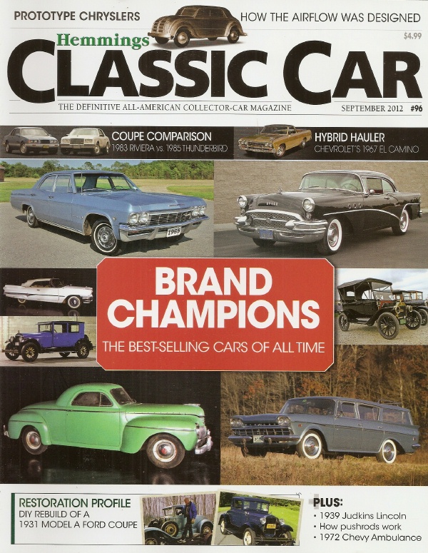 HEMMINGS CLASSIC CAR 2012 SEPT - JUDKINS-LINCOLN, AIRFLOW DESIGNS, EL CAMINOWithin this issue you will discover the following special topics 1) The largest selling car per brand 2) An '83 Buick Riviera vs. an '85 Thunderbird 3) A sweet '72 Chevy Suburban ambulance 4) Four-speed transmissions from the '30s 5) A sharp 1 of 1 '39 Judkins-bodied Lincoln 5-passenger limousine 6) History of automotive design: The 1931-'33 Airflow prototypes 7) Up close with Bob Lichty 8) Restoring a '31 Ford Model A 9) Remembering James J. Storrow 10) Mechanical Marvels: Pushrods 11) Richard Throop and his days with the Fisher Body Plant 12) A beautiful '67 Chevy El Camino 13) Looking back to the '48 Federal Model 65 heavy tractor Plus the following regular topics: 1) The latest in auction news 2) Tech & restoration questions and answers3) Lost and found classics 4) Classic auto art 5) Letters to the editor Plus other interesting classic car items. |