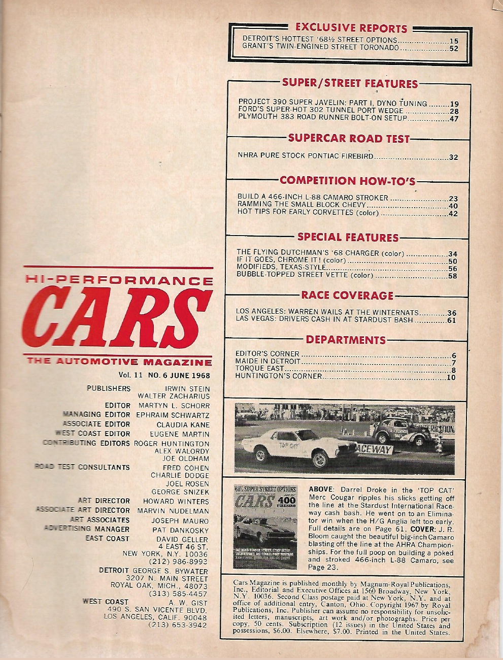 Reviews HI PERFORMANCE CARS 1968 JUNE - PROJ 390 SUPER JAVELIN, 466 L-88 CAMARO, 383 RR*