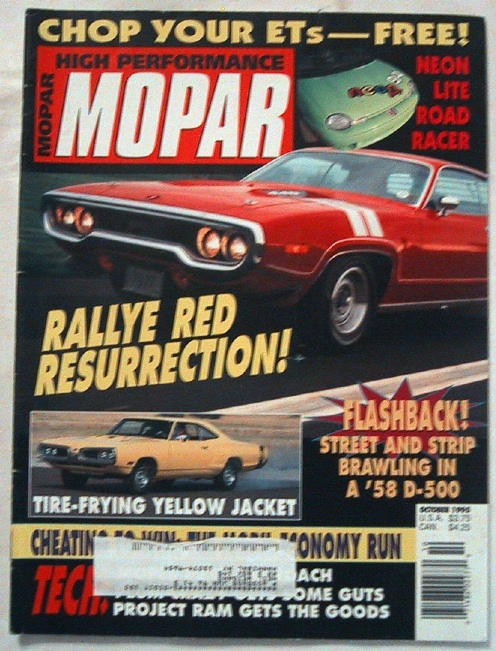 HIGH PERFORMANCE MOPAR 1995 OCT - 1958 300D, TOP BANANA This issue covers the following topics: 1) A lovely Six Pack Top Banana '70 Super Bee 2) A new interior for a '71 Challenger 3) Electronic ignition/alternator for a '60s car 4) The 1967 Mobil Economy Run 5) A sweet '58 300D 6) A restored '71 GTX 7) Twenty truck tips 8) Tips for a lower ET 9) A SCCA set up '73 Cuda AND MANY MORE TECH AND CAR FEATURES. |