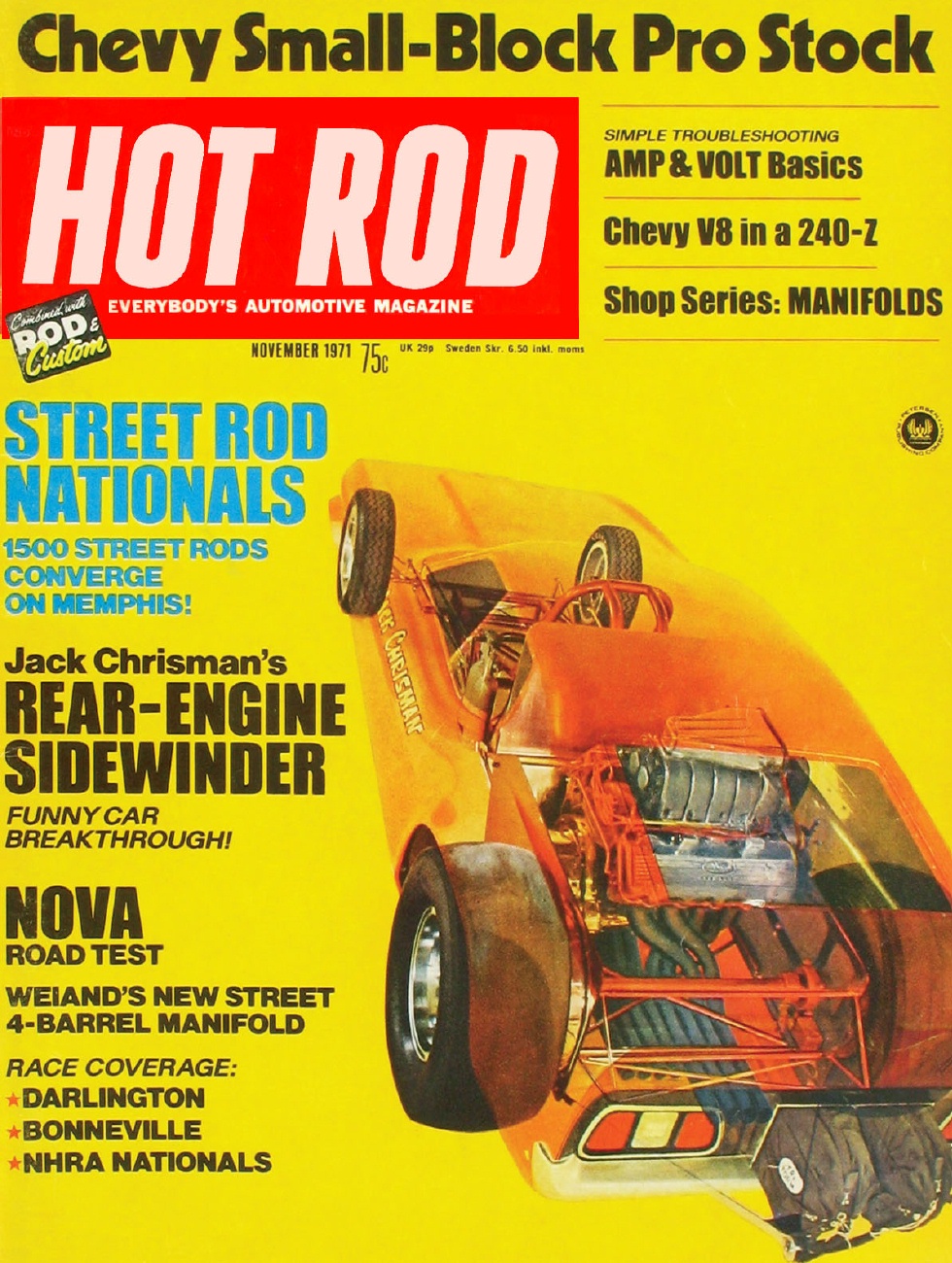 HOT ROD 1971 NOV - CHRISMAN, VEGA-V8-240Z, BUTCH LEALThis issue covers the following topics: 1) Jack Chrisman's rear-engined SOHC 427 Mach 1 Funny Car 2) A killer Datsun 240Z with an LT-1 Chevy 3) The Bonnevile National Speed Trials 4) Understanding an amp & volt meter 5) Butch Leal & his " 6) The science of intake manifolds 7) The Grandnationals 8) Testing the 1972 V-8 Nova 9) The Southern 500 10) Sam Gianino's B/Gas Challenger 11) The NHRA Nationals 12) Gary Kimball's wicked V-8 Vega D/MP 13) The LSR 427 Chevy powered Can-Am car 14) The Street Rod Nationals 15) Building the ' 16) Land speed motorcycles AND MANY MORE FEATURES. |