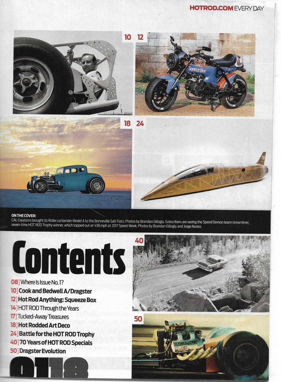 HOT ROD 2018 JAN - LAND-SPEED, SQUEEZE BOX, A/DRAGSTER, ART DECO, 70 YR ANNIV