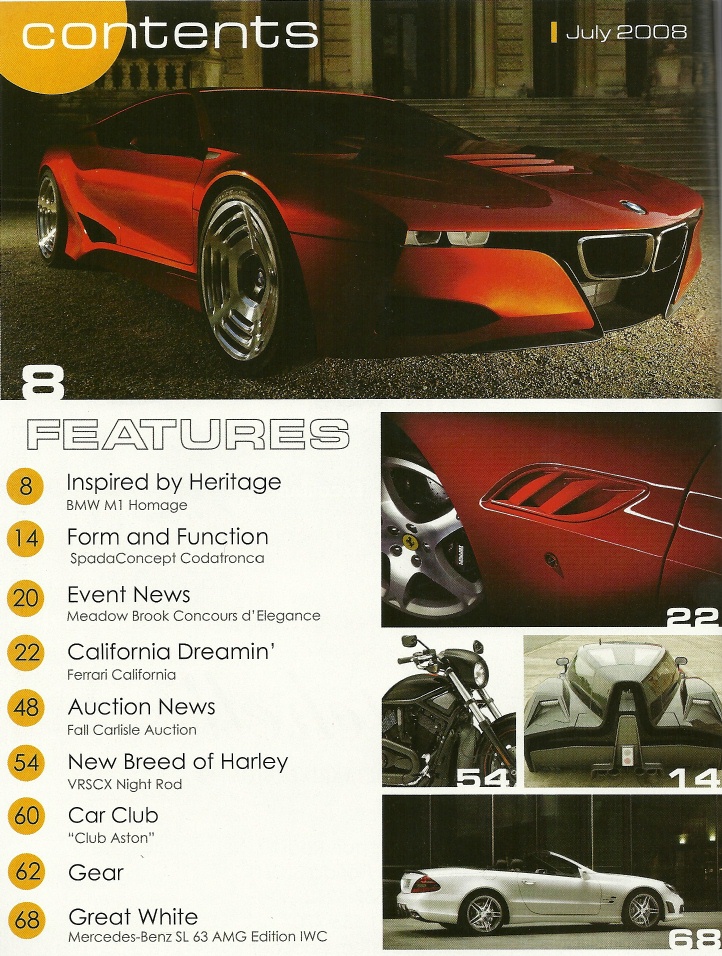 Reviews LUXURY AUTO 2008 JULY - FERRARI CALIFORNIA, SPADACONCEPT CODATRONCA, BMW M1