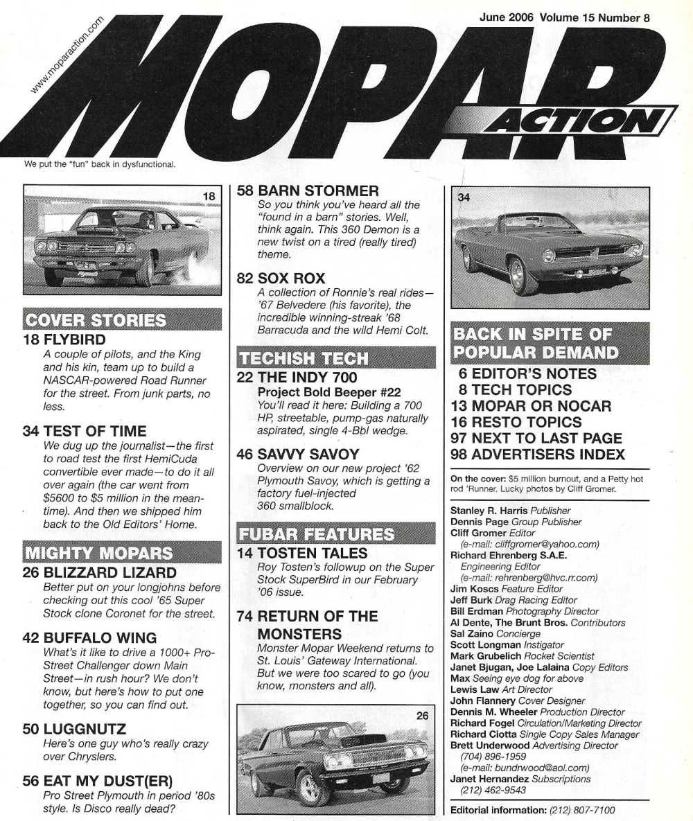 Reviews MOPAR ACTION 2006 JUNE - FI INJ SWAP, RONNIE SOX'S RACERS, PETTY,70 CUDA RAGTOP*