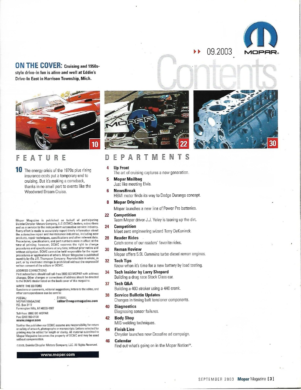 Reviews MOPAR MAGAZINE 2003 SEPT - CRUISING, DODGE SRT-4 GOODIES, DIAGNOSING SENSORS