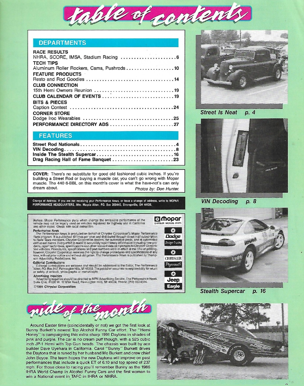 Reviews MOPAR PERFORMANCE NEWS 1991 JUNE - RACE RESULTS, ALUM ROLLER ROCKERS-CAMS-RODS