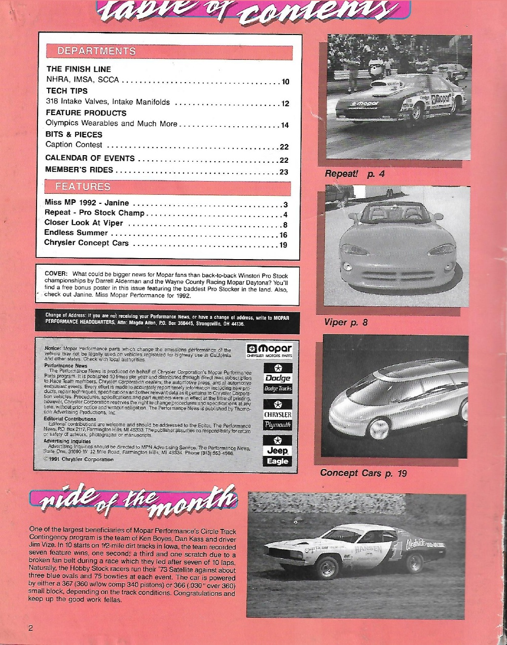 Reviews MOPAR PERFORMANCE NEWS 1991 NOV - VIPER, CONCEPTS'92, PRO STOCKS, ALDERMAN*