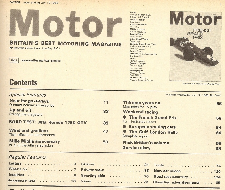 Reviews MOTOR 1968 JULY 13 - FRENCH GRAND PRIX, GULF LONDON, APLPHA 1750 GTV