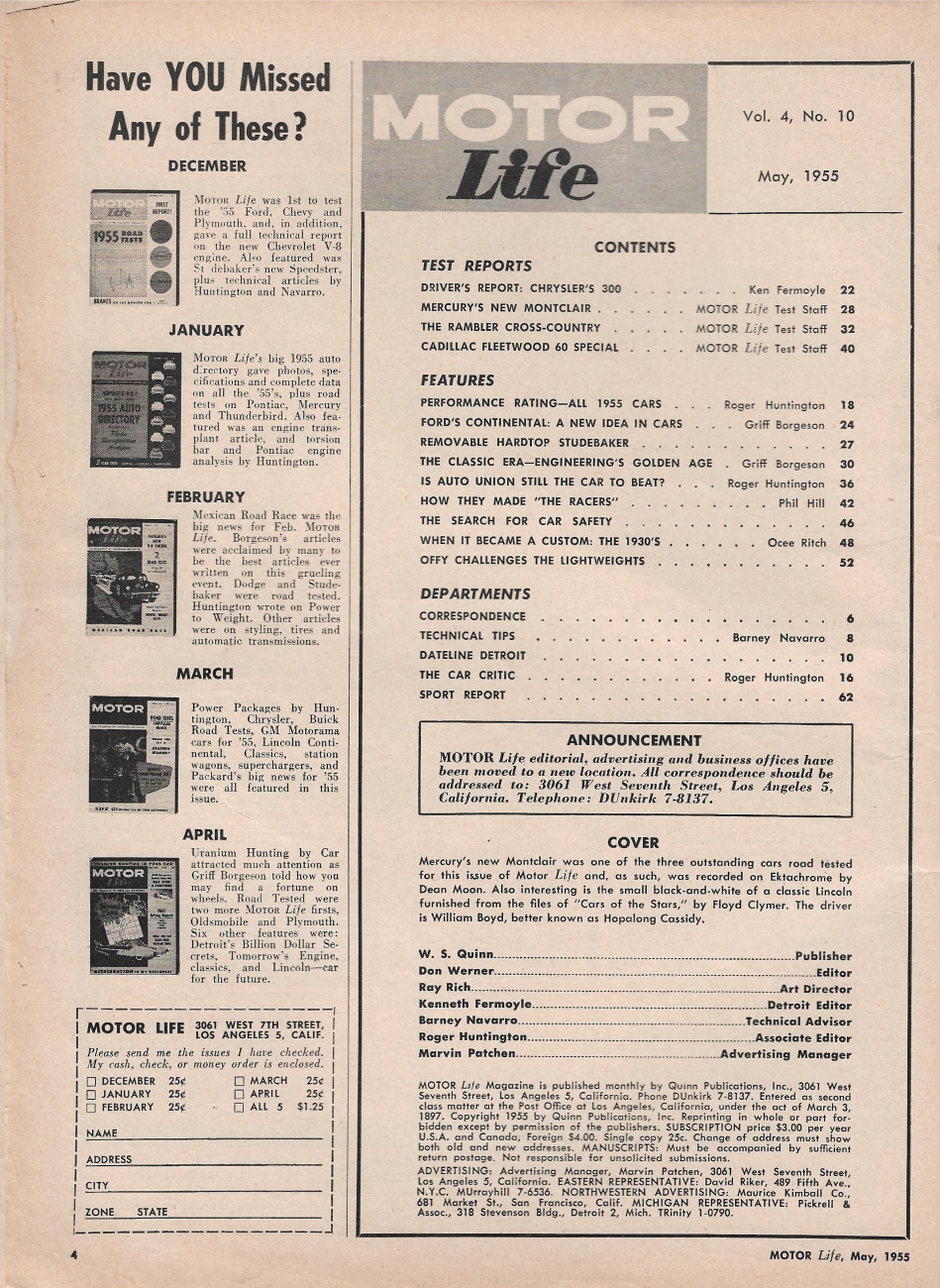 Reviews MOTOR LIFE 1955 MAY - FORD CONTINENTAL, TESTS: CADILLAC, MONTCLAIR, RAMBLER*