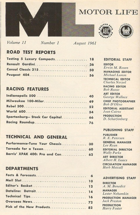 Reviews MOTOR LIFE 1961 AUG - LUX COMPACT TESTS,PEUGEOT 404, RENAULT,GORDINI,REBEL 300