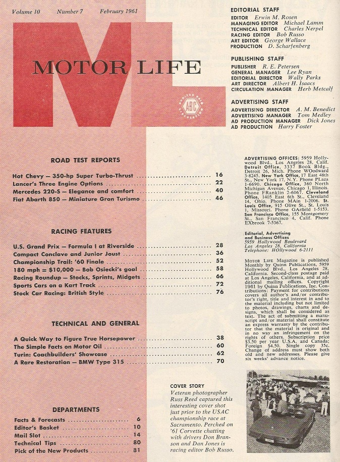Reviews MOTOR LIFE 1961 FEB - FIAT ABARTH, MERCEDES 220 S, RIVERSIDE GP, LANCER