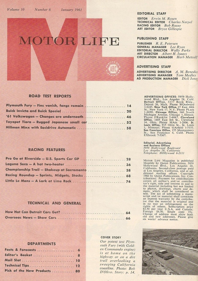 Reviews MOTOR LIFE 1961 JAN - FURY, INVICTA, BUICK SPECIAL, VW, MINX, TIARA TESTED