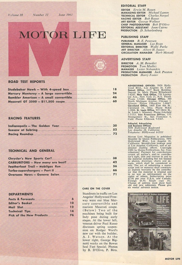 Reviews MOTOR LIFE 1961 JUNE - MONTERY, AMERICAN, HAWK, MAZERATI 3500, INDY