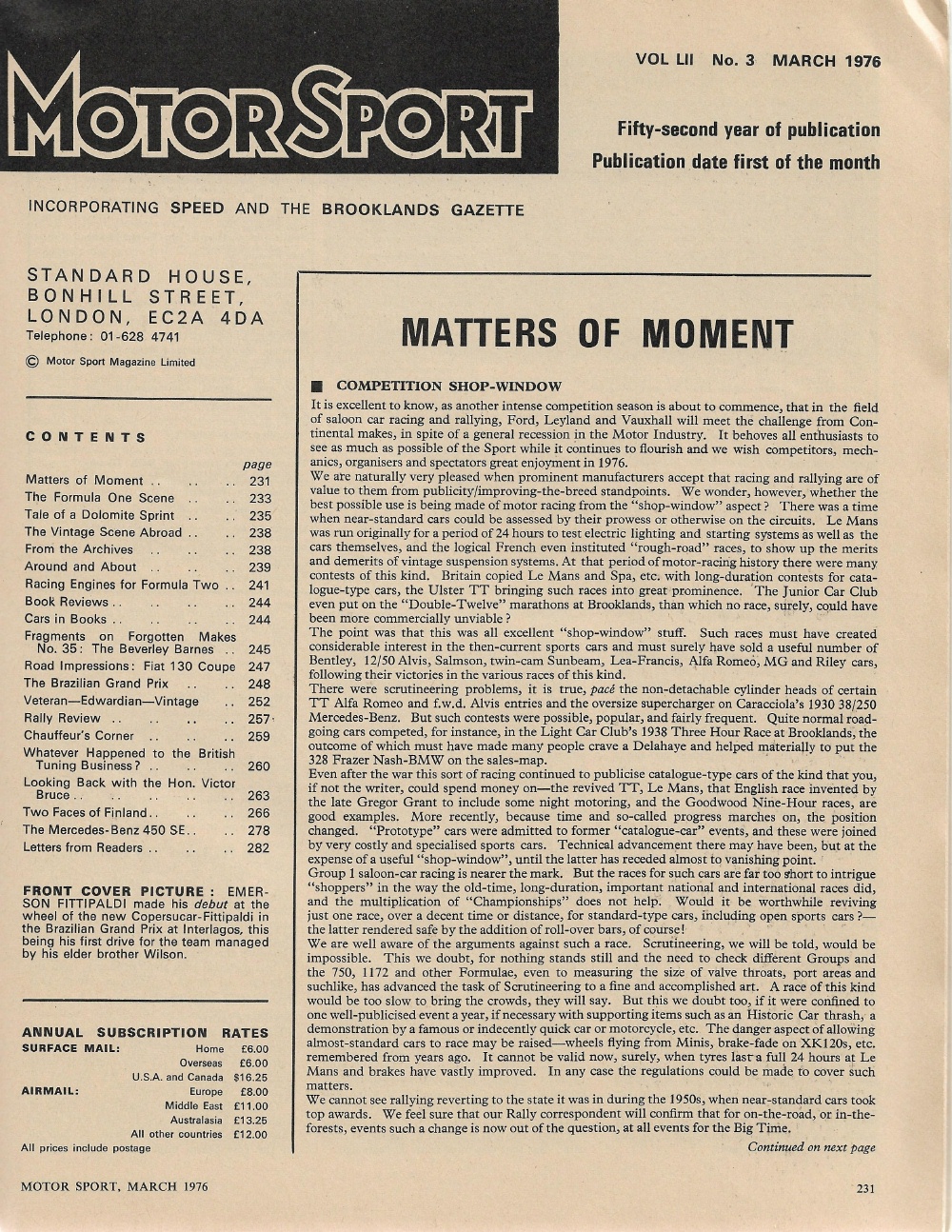 Reviews MOTOR SPORT 1976 MAR - FIAT 130, M-B 450 SE, BUGATTI 3.3L TYPE 59