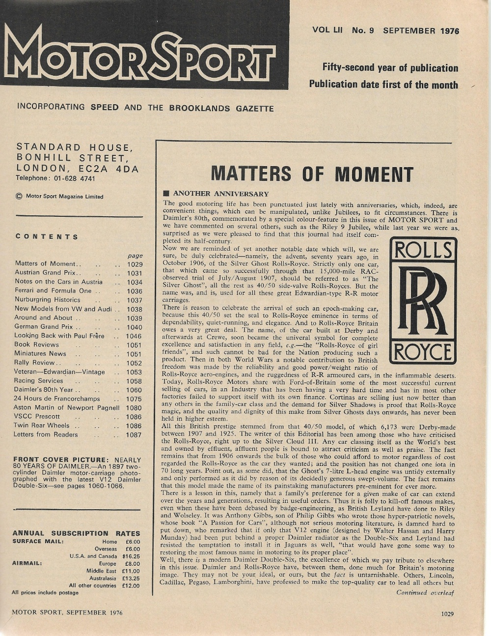 Reviews MOTOR SPORT 1976 SEPT - DAIMLER HISTORY, INSIDE ASTON MARTIN, FRERE