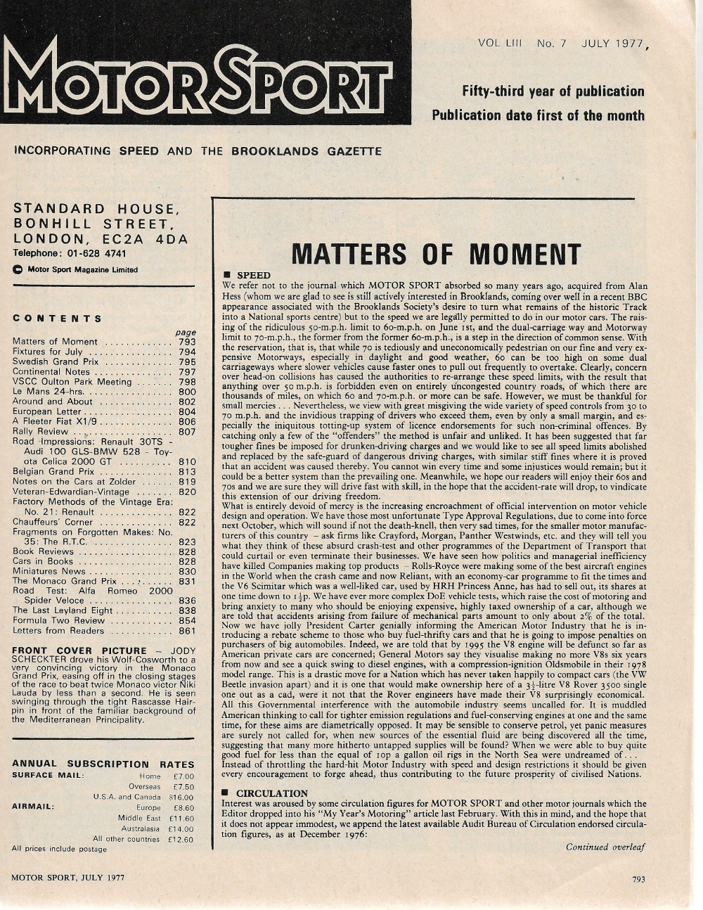 Reviews MOTOR SPORT 1977 JULY - FLEETER X1/9, LELAND 8, ALFA SPIDER VELOCE, RTC