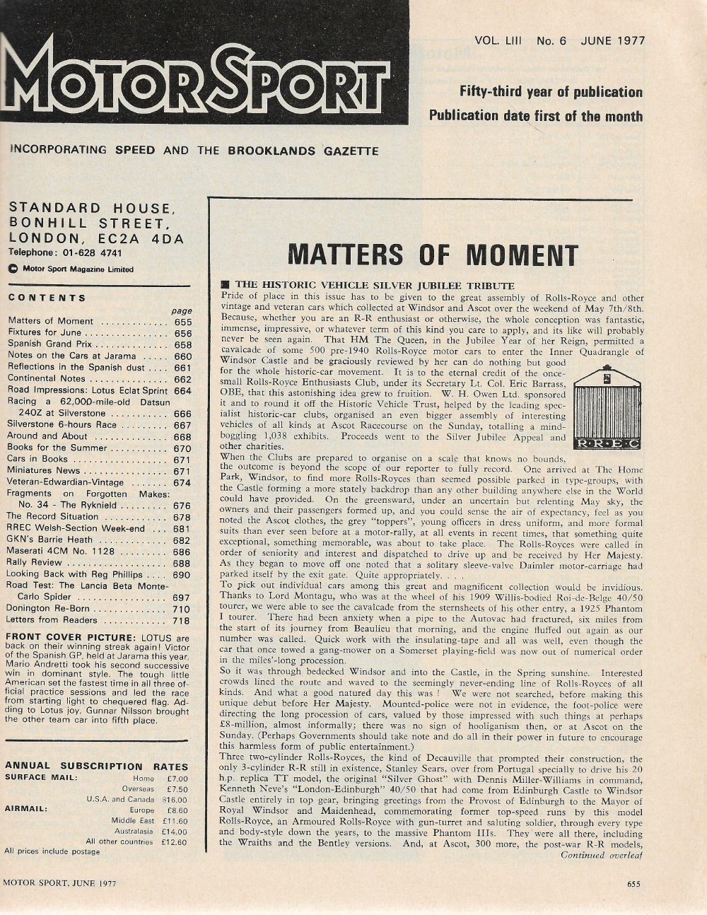 Reviews MOTOR SPORT 1977 JUNE - LOTUS ECLAT SPRINT, 240Z, 4CM, BETA M-C SPIDER