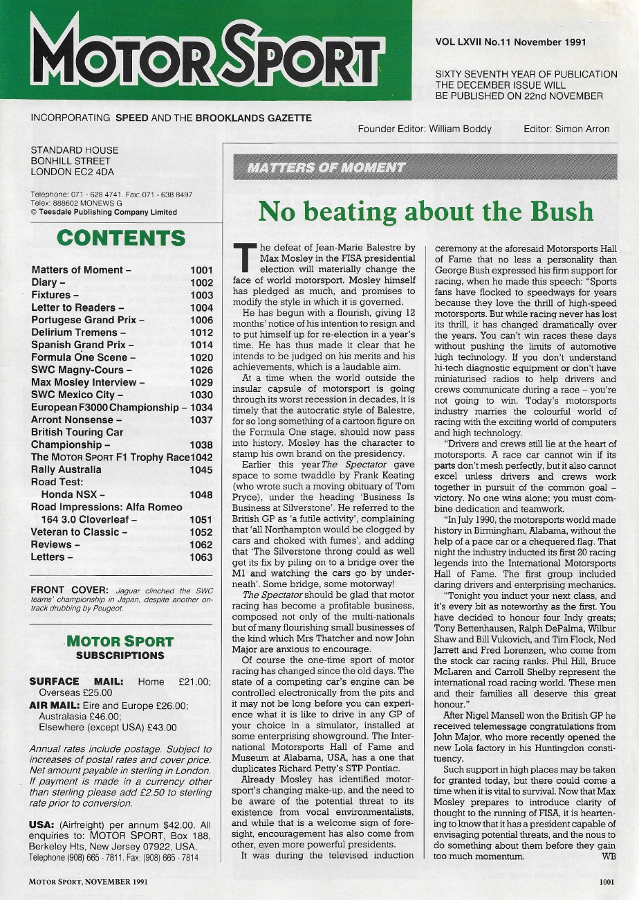 Reviews MOTOR SPORT 1991 NOV - ACURA NSX, ALFA 164 3L CLOVER, DOUGLAS LIGHT CAR