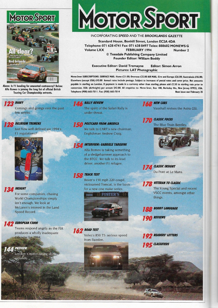 Reviews MOTOR SPORT 1994 FEB - BLUE TRAIN BENTLEY, VOLVO 850 T5, CHAS MORAN
