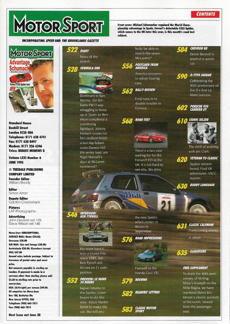 Reviews MOTOR SPORT 1995 JUNE - FERRARI F355, 924 CARRERA GT, D-TYPE, CHEVRON B8*