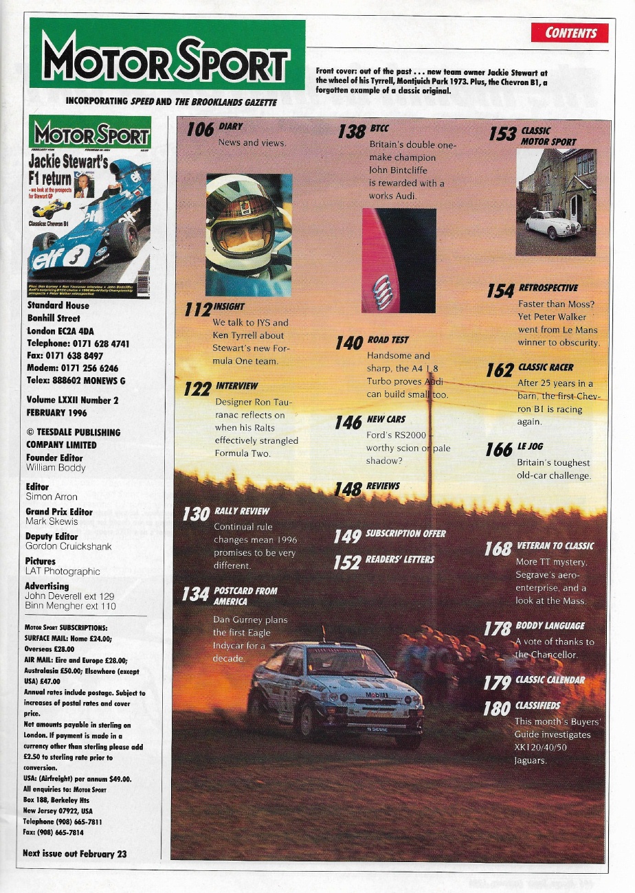 Reviews MOTOR SPORT 1996 FEB - CHEVRON B1, ESCORT RS2000, AUDI A4, WALKER, TT