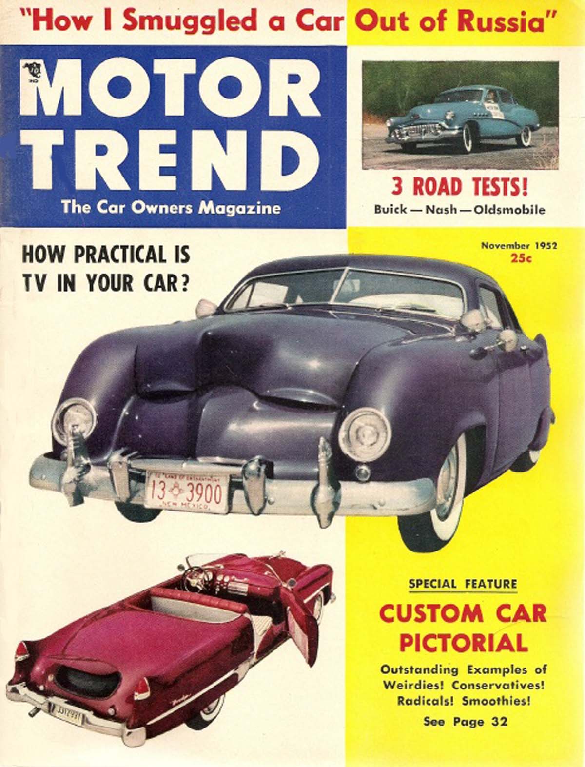 MOTOR TREND 1952 NOV - SUPER 88, AMBASSADOR & ROADMASTER TESTED, POBEDAWithin this issue you will discover the following topics: 1) Auto news from 2) Stanley Slotkin & his Russian Pobeda 3) How Practical is TV in Your Car 4) Testing the new Olds Super 88 5) Testing the new Buick Roadmaster 6) Testing the new Nash Ambassador 7) A review of the Bonneville National Speed Trials 8) The latest custom trends 9) Racing news from Plus many other items. |