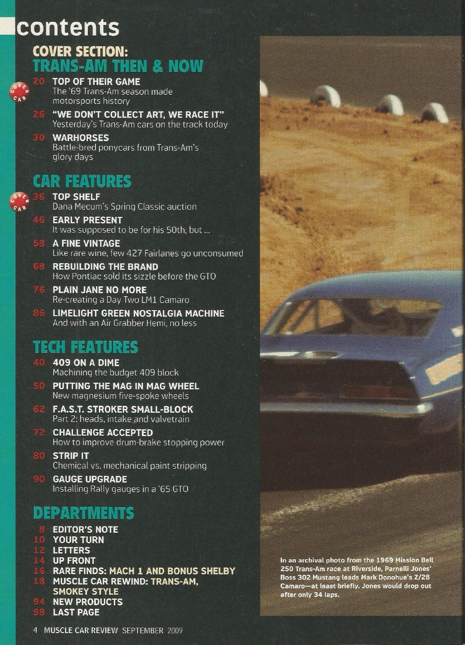 Reviews MUSCLE CAR REVIEW 2009 SEPT - TRANS AM BOSS & Z, 427 FAIRLANES, LIME HEMI*