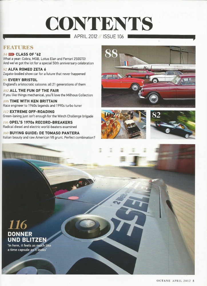 OCTANE 2012 APR - CLASS OF ?62, ALFA ZETA 6, ALL BRISTOLS, KEN BRITTAIN 12 APR: OPEL ELECTRIC & DIESEL RECORD BREAKERS, PANTERA, DENNY HULME, CLASS OF ?62 INCLUDED: COBRA, MGB, LOTUS ELAN & FERRARI 250GTO