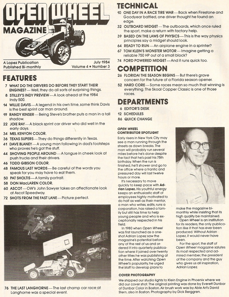 Reviews OPEN WHEEL 1984 JULY - WILLIE DAVIS, RANDY KINSER, PAT SHOLTIS, LANGHORNE