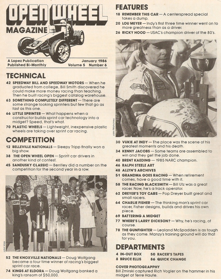 Reviews OPEN WHEEL 1986 JAN - RICKY HOOD, LOU MEYER, CHARLIE FISHER, KENNY JACOBS
