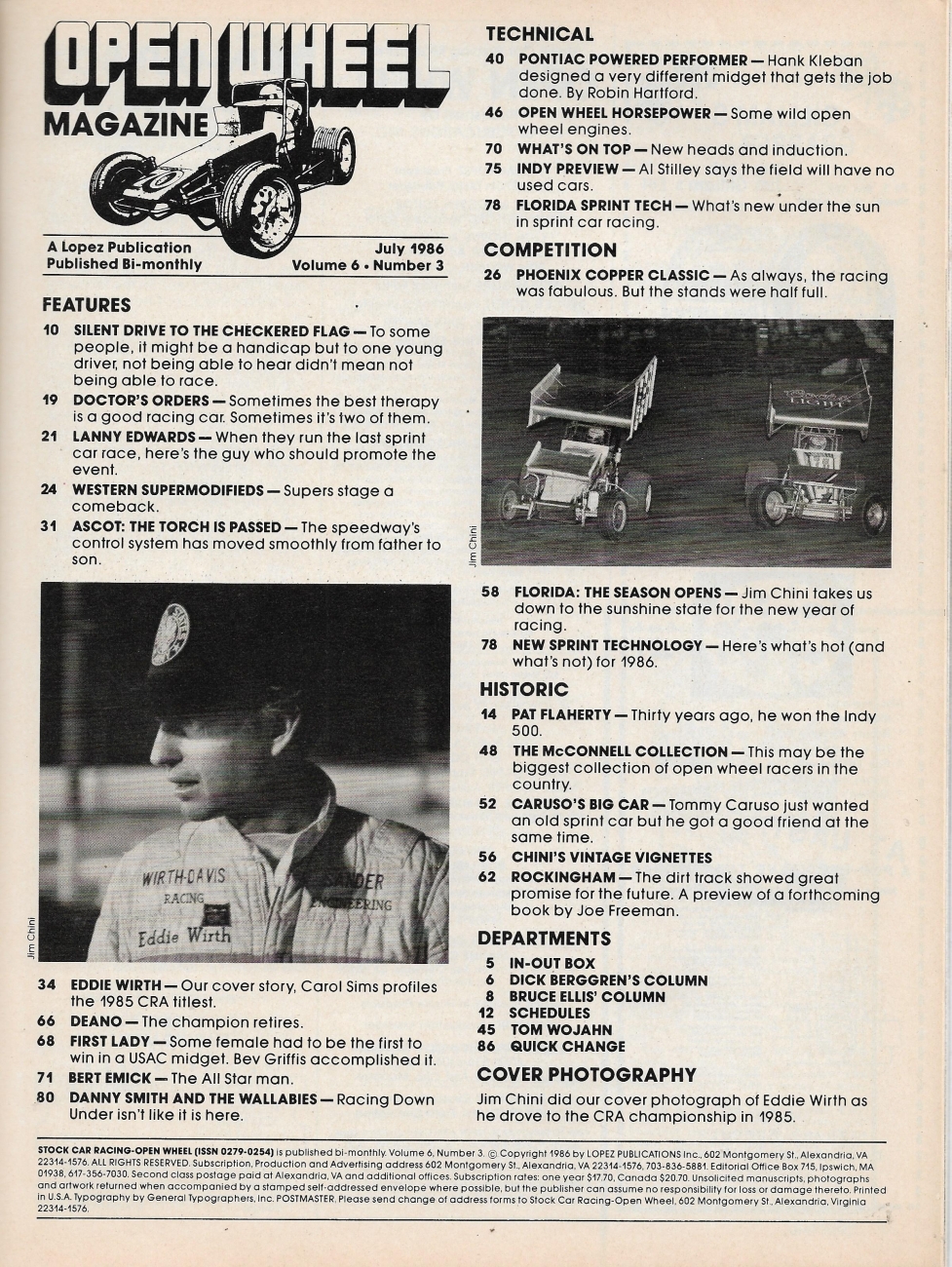 OPEN WHEEL 1986 JULY - PONTIAC ENGINE, PAT FLAHERTY, EDDIE WIRTH