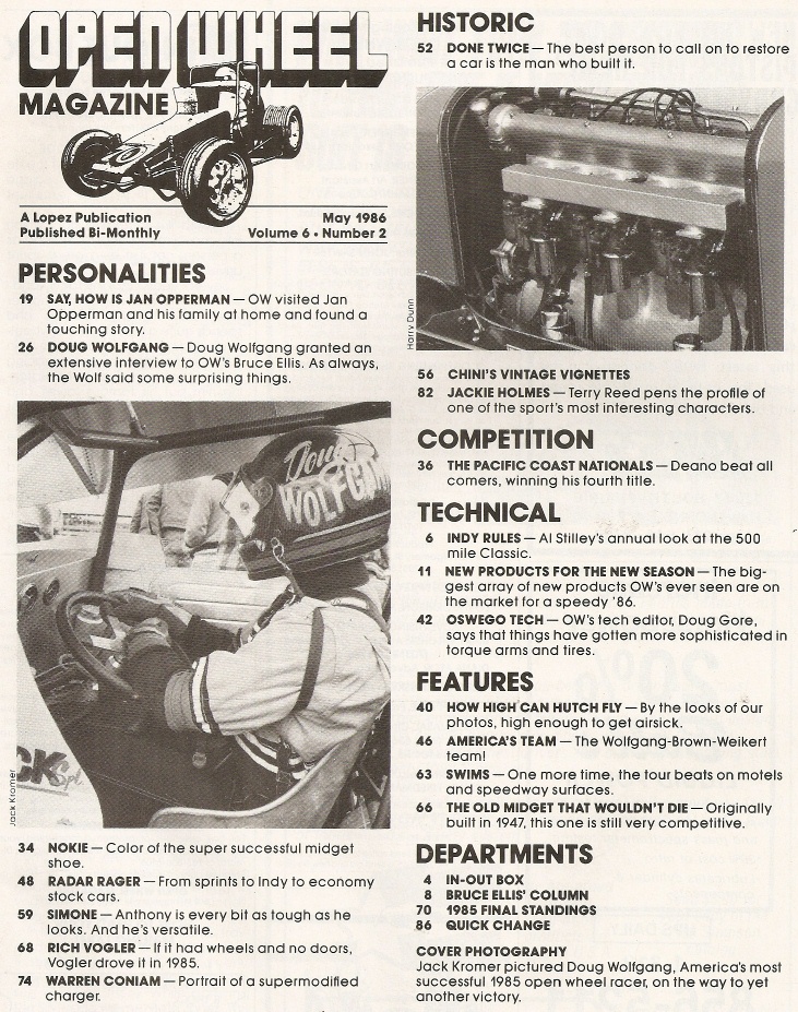 Reviews OPEN WHEEL 1986 MAY - D WOLFGANG, RADAR RAGER, RICH VOGLER, WARREN CONIAM