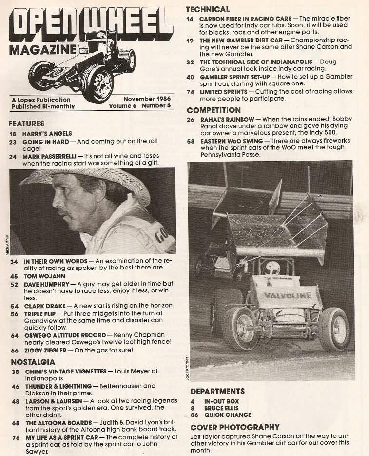 Reviews OPEN WHEEL 1986 NOV - DAVE HUMPHRY, CLARK DRAKE, ZIGGY ZIEGLER, LOUIS MEYER